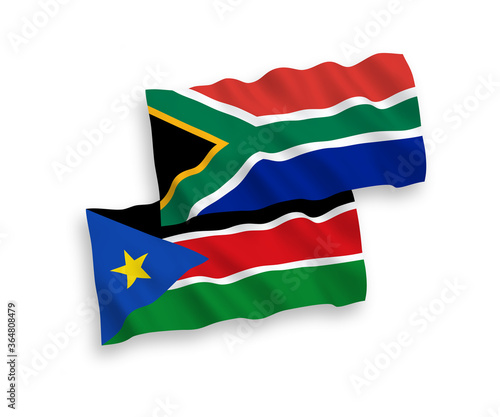 National vector fabric wave flags of Republic of South Sudan and Republic of South Africa isolated on white background. 1 to 2 proportion.