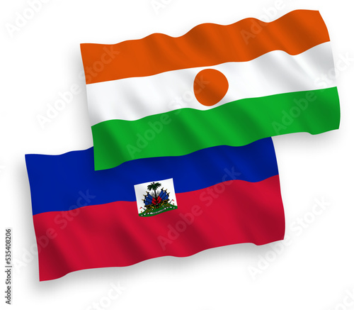 National vector fabric wave flags of Republic of the Niger and Republic of Haiti isolated on white background. 1 to 2 proportion.