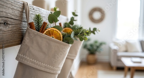 Natural linen bag with dried orange slices and eucalyptus leaves arrangement. Eco-friendly holiday decoration in sustainable rustic style. Organic festive concept. Eco-friendly gifts, natural crafts