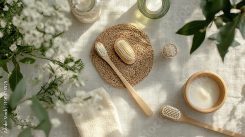 Natural self-care flat lay with bamboo toothbrushes, beauty products, and fresh greenery showcasing eco-friendly lifestyle and wellness concept