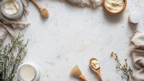 Natural skincare products and brushes on textured background