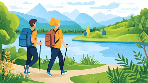 Nature Hikers on Scenic Trail by a Calm Lake with Mountains