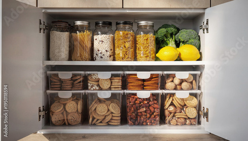Neatly organized kitchen pantry cabinet with glass jars and clear containers filled with dry goods, fresh broccoli, and bright lemons