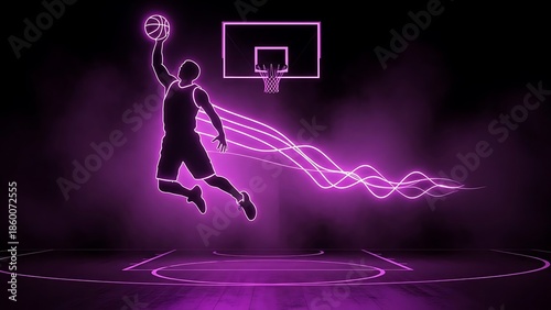 Neon basketball player in mid air shooting towards a glowing hoop
