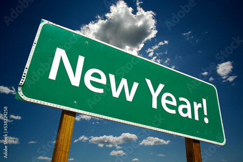 New Year Green Road Sign Under Beautiful Blue Cloudy Skies