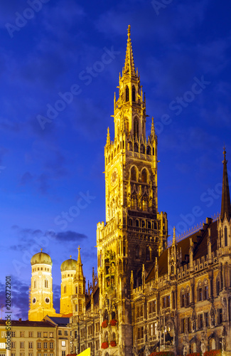 Night view of New Town Hall Marian column on Marienplatz in Munich, Bavaria