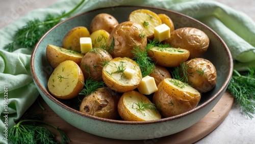 No people: homemade baked new potatoes with butter and dill