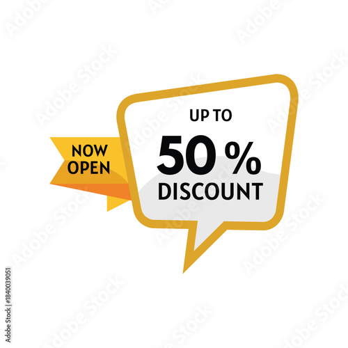 Now Open 50% Discount Promotion Badge – Sale Offer Speech Bubble Label Vector
