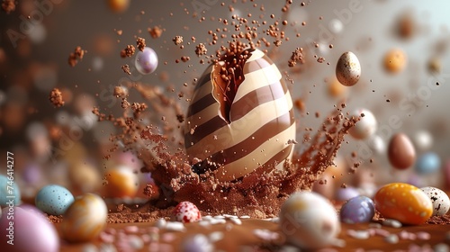 œuf de paque en chocolat avec motifs qui éclabousse du chocolat liquide