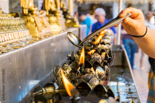 Oil filling in Thai style metal candle in Doi Suthep temple, Chiang Mai, Thailand. Selective focus with blurred background