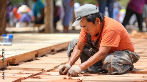 Old Asian worker assembles wooden round foundation of eco house at construction site