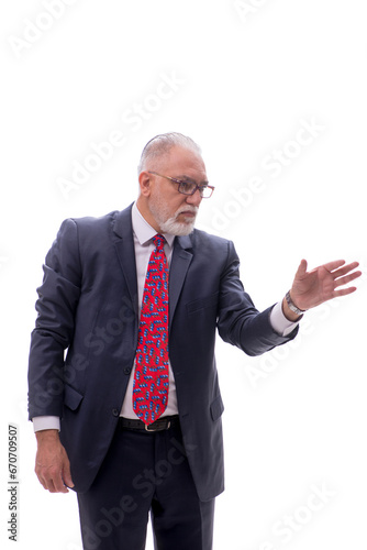 Old businessman pressing virtual button isolated on white