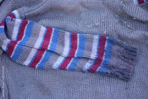one dirty striped sleeve lies on a gray old wool sweater