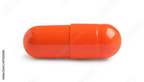 One orange pill on white background. Medicinal treatment