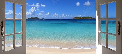 Open Window View Of Tranquil Beach With Turquoise Water And Blue Sky, A Relaxing Vacation Scene