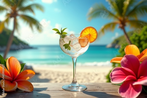 Orange slice garnish on glass of water with ice at beach