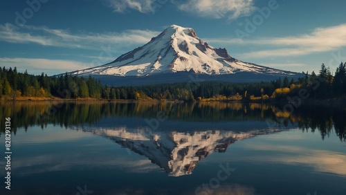 Oregon, United States travel poster or luggage sticker. Scenic illustration of Mt. Hood behind lake with reflection.