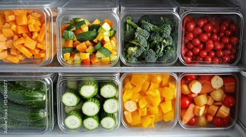 Organized vegetables in clear fridge containers.