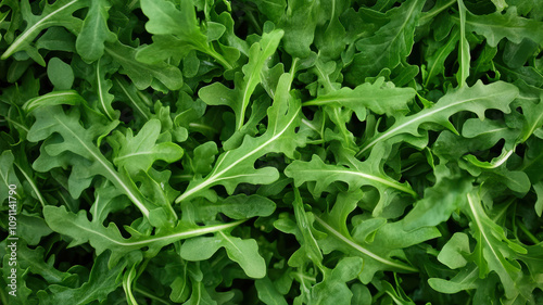 Overhead View of Fresh Arugula Leaves Showcasing Vibrant Green Hues and Texture