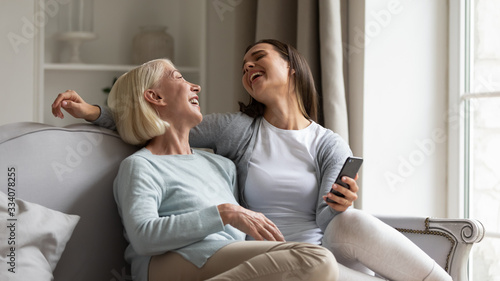 Overjoyed mature mother and millennial grown-up daughter relax on sofa in living room laugh watch funny video on smartphone, happy senior mom and adult girl child have fun using cellphone together