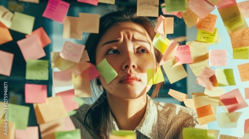 overwhelmed woman surrounded by sticky notes