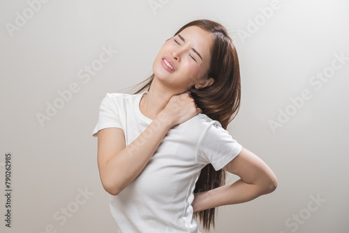 Pain body muscles stiff problem, asian young woman, girl painful with back, neck ache from work hand holding massaging rubbing shoulder hurt, sore on white background. Health care and medicine concept