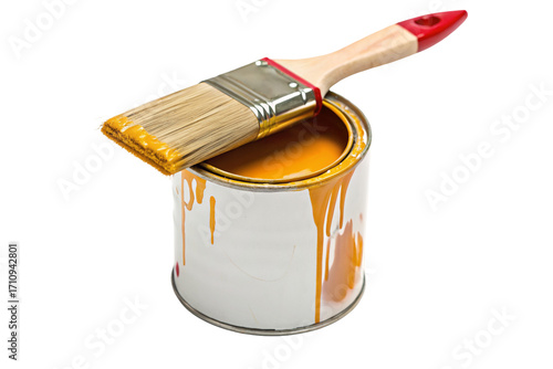 Paint brush atop open orange paint can with dripping sides for vibrant redecoration projects