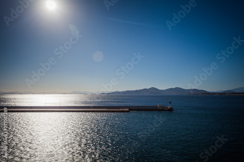 Panorama with sun reflections at the entrance to the port of Piraeus, Athens