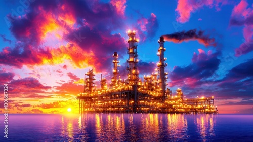 Panoramic scenic view of a vast and expansive oil refinery plant complex illuminated by the golden light of sunset or sunrise The industrial facility with its network of towers pipes