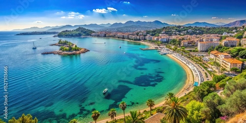 Panoramic shot of Cannes coastline from above with crystal-clear waters and surrounding hills in Provence, France , waters