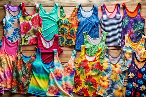 Panoramic View of Colorful Tank Tops on Display, Summer Fashion Trends, Casual Wear, Unique Designs, Vibrant Patterns, Shopping Experience, Wardrobe Essentials, Beachwear Styles, Trendy Apparel