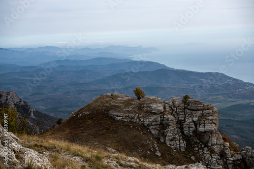 panoramic view of yellow autumn mountains against a background of blue haze and storm clouds filmed from a drone