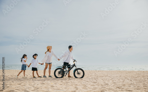 Parents and children walking on the sandy beach pushing bicycles a family scene filled with smiles happiness and the carefree enjoyment of a day under the sun. Family on beach vacation