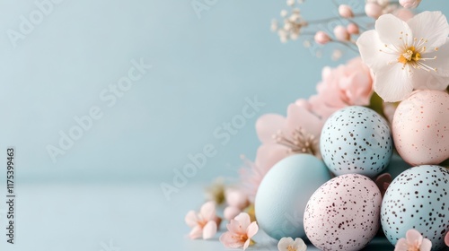 Pastel Easter eggs nestled in delicate spring blossoms, a gentle, spring-like scene.
