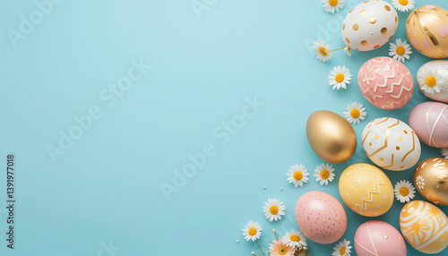 Pastel pink gold yellow Easter eggs with daisy flowers on light blue background. Spring festive decoration. Elegant painted designs with polka dots, zigzags, florals. Soft joyful holiday mood