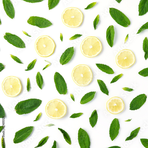 Pattern of mint and lemon. Food background with citrus. Mint leaves, lemon slices isolated on white background. Top view, flat lay.