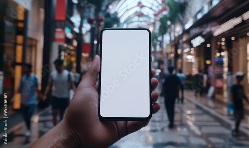 People walking in front of department store and man using blank screen mobile phone