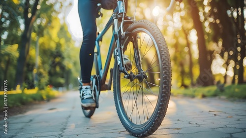 Person cycling through a city park urban fitness commuting eco friendly transport