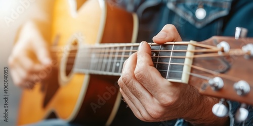 Person playing acoustic guitar, close-up of hands and strings, soft lighting.