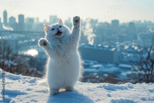 Pet health. Happy cute adult cat turkish angora in winter warm clothes, frosty breath from nose and mouth in chilly air. Jocular pets. Kitten winter coat. Winter cat house. Winter cat collar.
