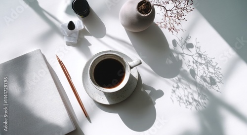 Photo of a minimalist white desk with coffee on a clean background with copy space for text or logo.
