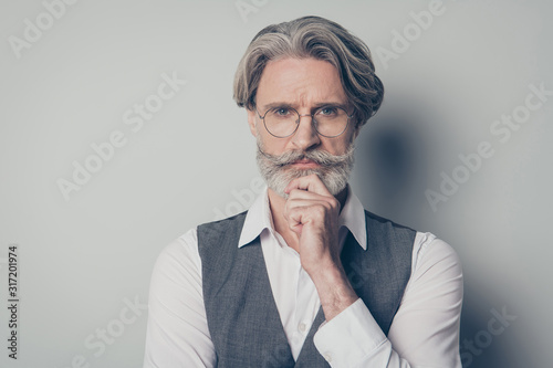 Photo of aged handsome business man looking seriously touch perfect neat hairdo bristle thinking over new project wear specs white shirt waistcoat isolated grey color background