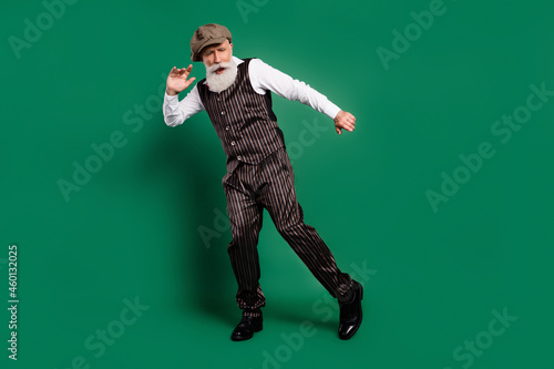 Photo of funny inspired senior man enjoy pub party dance wear cap striped suit scarf on green color background