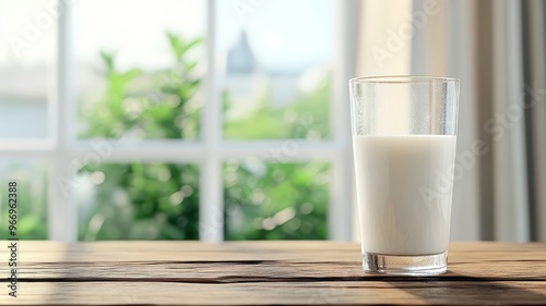 Photorealistic glass of milk on a rustic table, glistening condensation, soft light.