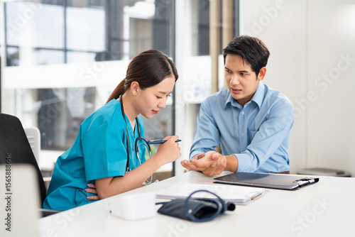 Physiotherapist, doctor and patient man with Carpal Tunnel Syndrome hand Wrist pain for rehabilitation, consulting and exercise. Healthcare, physical therapy medical service, wellness and support.