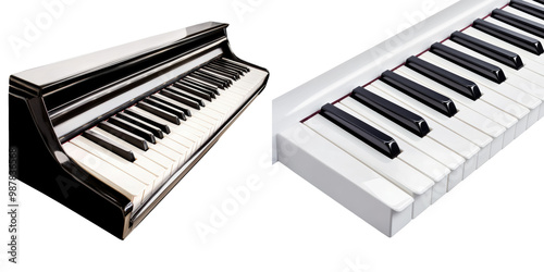 Piano keyboard with black and white keys on transparent background