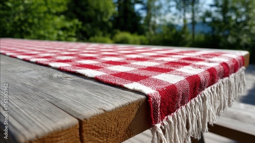 Picnic Table with Red and White Gingham Runner on Wood Surface in Outdoor Setting Close Up Shot