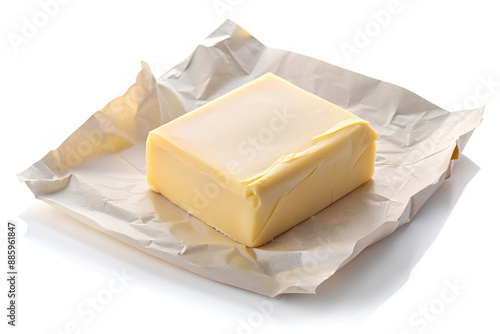 Piece of butter on package paper isolated on white background.