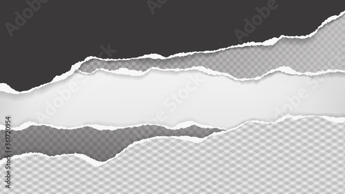 Pieces of torn, ripped black and grey paper with soft shadow are on white background for text. Vector illustration