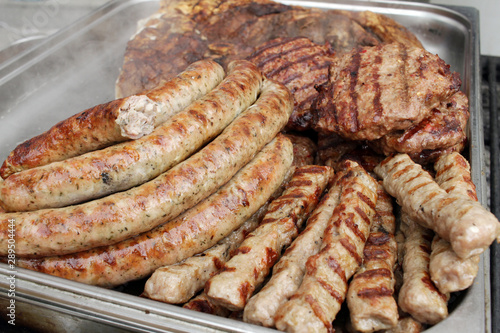 Pile of different grilled meat. Wurst, burgers, sausages, meatballs on a barbeque